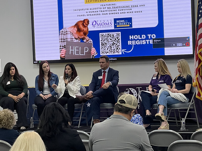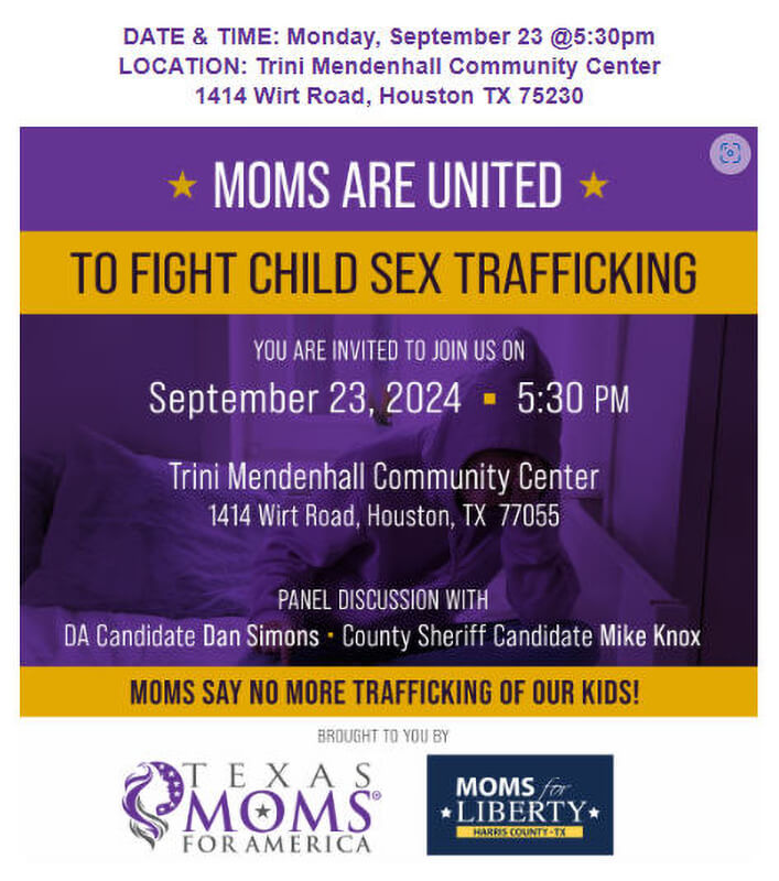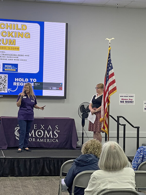 Courtney Litvak was the guest speaker invited to share how she was trafficked from her high school in Katy, Texas and the work she now does to combat grooming and trafficking of children in public schools. Cassie Fletcher, Acting Director of Membership at Moms for America spoke on the importance of organizations collaborating to make a difference. Dan Simons, Moms for America endorsed candidate for Harris County District Attorney shared his story of growing up in foster care and the abuse he and many children in foster care endured. Both he and Sheriff candidate Mike Knox detailed the plans they would implement to combat trafficking in the third most populous county in the United States. Congressman Morgan Luttrell, District Director, also spoke on the congressman’s behalf voicing his commitment to leading the fight to protect the innocent from being lost into the sex industry. Attendees were activated to help be the army needed to save the children.
