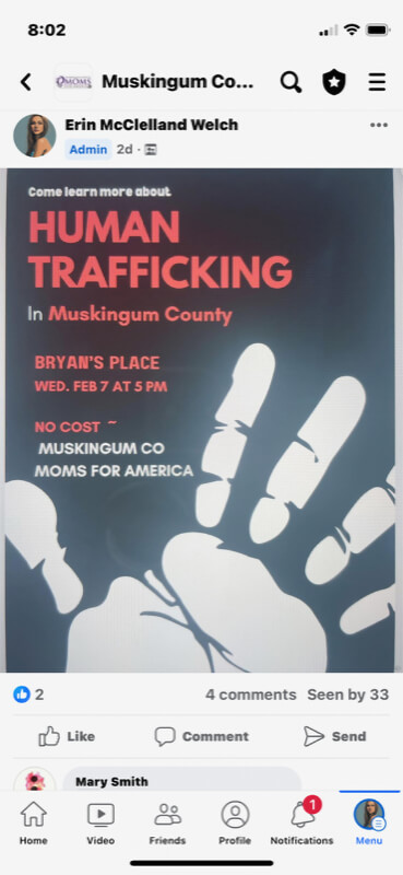 On February 7, 2024, Group Leader, Erin Welch and her Muskingum County Moms for America group held their second meeting. At this meeting, they had Ron Welch (Muskingum County Prosecutor) and Janet Long from the organization called, “Forever Dads”. These speakers talked about human trafficking. Janet specifically talked about her job and how she works with trafficking victims from their region and participates in prevention work.