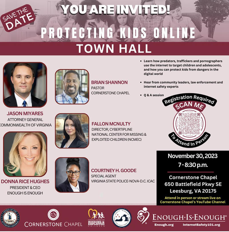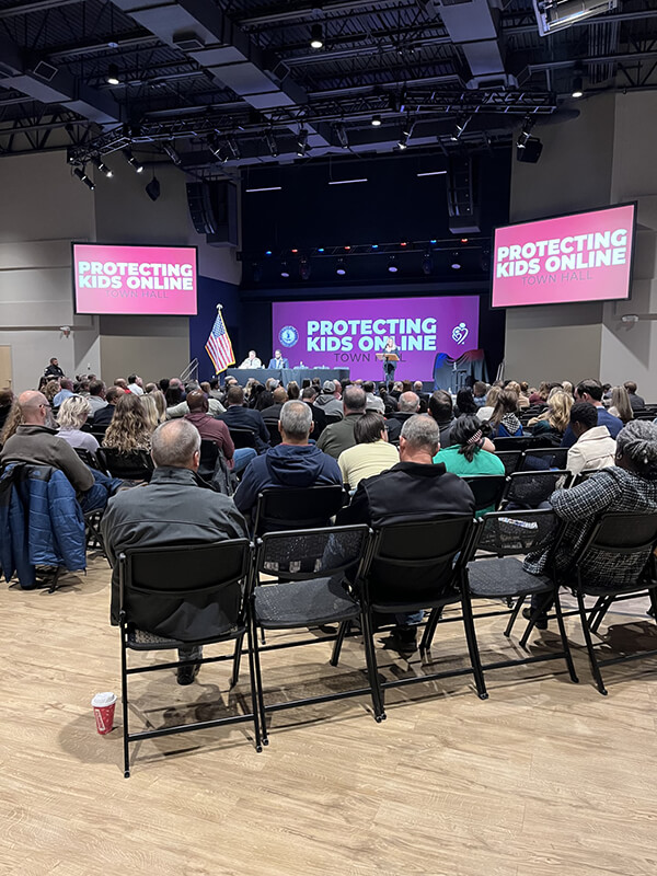 On November 30, 2023, State Liaison Tyler Ohta (Virginia Moms for America) set-up a Moms for America table and attended the Protecting Kids Online: Town Hall event located at Cornerstone Chapel in Leesburg, Virginia. This event was to help parents learn how predators, traffickers and pornographers use the internet to target children and adolescents, and how you can protect kids from dangers in the digital world. Also to hear from community leaders, law enforcement and internet safety experts.