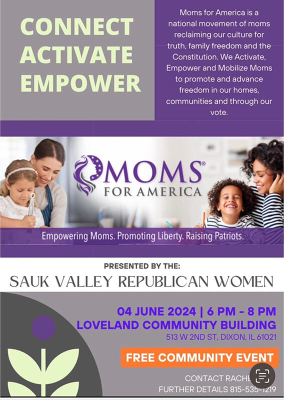 On June 4, 2024, Debbie Kraulidas (Vice President Moms for America) was invited to speak at the Sauk Valley Republican Women’s group in Dixon, Illinois. Crystal Loughran (LaSalle County Moms for America), Theresa Schmidt (LaSalle County Moms for America) and Dawn Damiani (Will County Moms for America) came to support Debbie and represent Moms for America. It was an encouraging night with a room filled with conservative women.