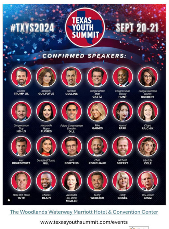 September 20, 2024. The Texas Youth Summit was a fantastic, two day event. Guest speakers included Donald Trump Jr. and Matt Gaetz, plus many others.