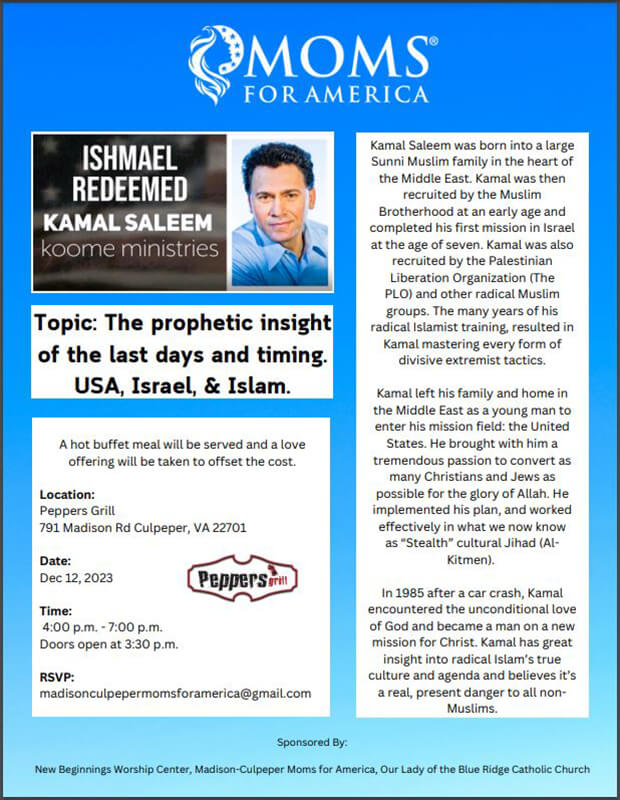 The Madison-Culpeper Moms for America coordinated with two local churches to have the event, The Ishmael Redeemed: Kamal Saleem Eve, on December 12, 2023. The topic of the event was: The Prophetic Insight of the Last Days and Timing. USA, Israel and Islam. Due to this coordination, they were able to have 95 people in attendance. As well as having Kamal Saleem speak, they were also able to promote Moms for America and collect names on who were interested.​